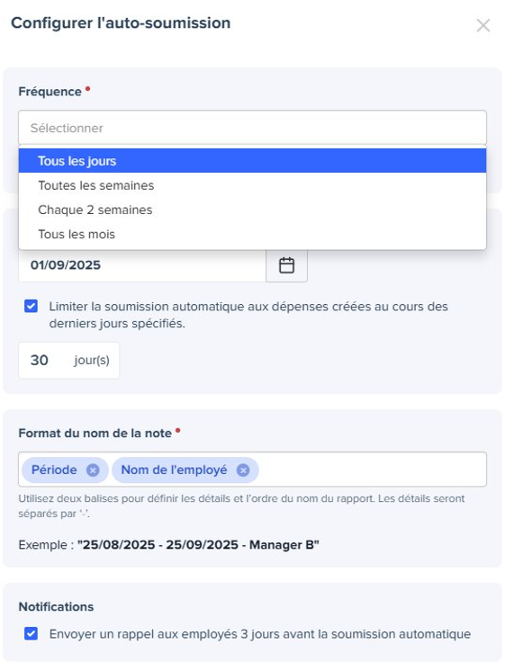 Cette fonctionnalité envoie automatiquement, à la place de vos collaborateurs, leurs dépenses ou notes au statut "vérifiée" selon la fréquence que vous définissez dans le paramétrage. Plus besoin d’attendre qu’ils s’en occupent manuellement !