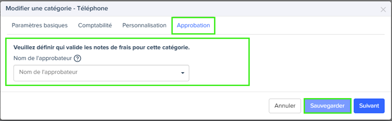 Une fois activé, un nouvel onglet “Approbation” apparaît dans chaque catégorie de dépense